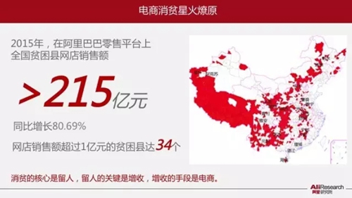 电商消贫星火燎原。2015年,在阿里巴巴零售平台上,832个国定贫困县网店销售额达215.56亿元,同比增长80.69%。其中,网店销售额超过1亿元的贫困县达34个,2014年为21个、2013年为11个。